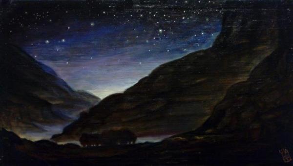 A Csillagok, amelynek folyókanyarja, hegyei mintha Markó Károly Visegrádját látnák sötéten, és mégis tele kontrasztáló harmóniával, a Tűz a völgyben, ami mintha valamely alföldi mester fasorát élné át egyszerre sötét-drámaian és lírával telten, a Kies táj fekete holdakkal, amelyen a (három!) fekete égitest kihívása kerül arányba a fás folyópart már-már impressziós könnyedségével.