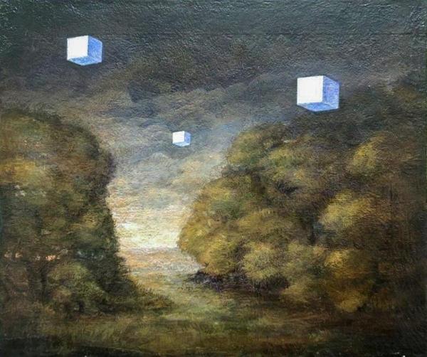 A bizarr, az elképesztő tájképekről fentebb már szó esett; ezek manifeszt módon mutatják Szurcsik nagyon sajátos, nagyon érett szürrealitását. Ám az egyszerre lángoló kunyhók, a lombok fölött lebegő kockák és a férfifülből kinövő ágak (Magánkert) provokációja mellett fel kell fedezni a kevésbé látványos, mert kevésbé kihívó eszközökkel megteremtett hasonló világérzést az újabb képek mélyén. A Titkok völgyén, amely csak azért talányos (de nagyon talányos), mert a nagy folyója egyszer csak véget ér minden magyarázat és indoklás nélkül a táj közepén, és azért lidérces, mert liláskék partfalai meg kevéssé idilli víztükre a kék, a vörös, a narancs és a zöld fenyegető foszlányaiból kavargó nagy eget tükrözi.