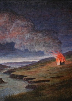 Három hajlék: a vásznon a poétikusan tizenkilencedik századi címnek megfelelően kanyargó folyó, szakadékos part, távoli, derengő ég és három kicsi kunyhó. Csak éppen mind a három úgy lángol és füstöl, mint a várak az a századi ostromképeken, és nem ez az egyetlen anomália a kiállítás címében ígért romantikához képest.