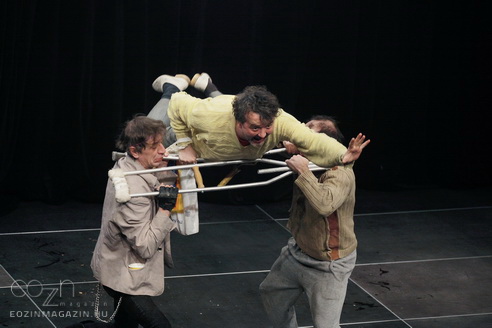 Dömötör megkísérli felvázolni, mi lehet a tanulsága az egész evolúciónak. A három szerencsétlen flótás mindennel megpróbálkozik; koldulnak, szánni való mutatványokban csetlenek-botlanak, még a közönséget is játszó(társa)kká teszik. Sorozatban szórják a poénokat, ami csak a csövön kifér. Ennek a színháznak az egyik legnagyobb erénye, hogy díszlet nélkül, néhány újrahasznosított kellékből dolgozik, a sikere pedig egyedül az alkotók tehetségén, leleményén áll vagy bukik.