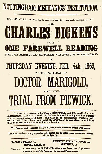 Modern íróhoz méltóan belépődíjat szedett nyilvános felolvasásaiért, habár a barátai eleinte óvták ettől. Ezeket remekül megszervezték, és széles körben hirdették. Nagy-Britannia és Amerika hatalmas előadótermeiben így sikerült telt házas esteket tartani, melyekre a jegyeket napok alatt eladták. Noha ezek a felolvasó estek egyre fárasztóbbak voltak Dickens számára, élete végéig vállalta az irodalmi haknikat. Mint vérbeli showman, nem tudott ellenállni az olvasókkal való személyes találkozás varázsának, melynek során nemcsak adott magából, de ösztönzést is kapott tőlük. Mindössze három hónappal halála előtt hagyott fel a médiaszereplésekkel. Mai szemmel viszonylag fiatalon, 58 évesen hunyt el, saját korában viszont igen idősnek tekintették.