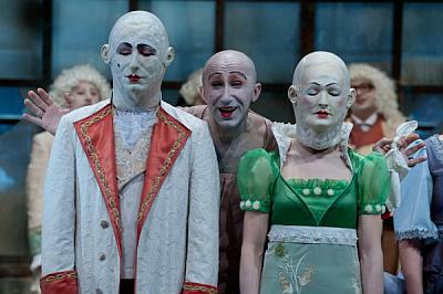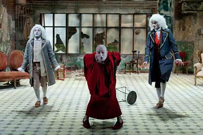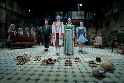 Fehérre mázolt arcú figurák balettoznak be a színpad közepére. Testüket barokkos jelmezek borítják, fejükön holdfényű paróka. Ruhájukból és álhajukból csak úgy száll a rizspor. Egybeolvad a kopott zöldbe és málló barnába öltözött helyiségben kavargó porral.