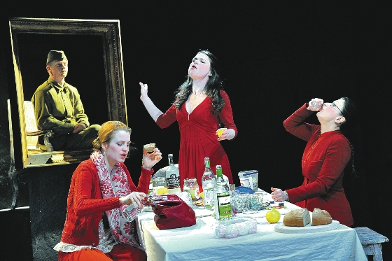 És zabálás és piálás. Kupicásból, vizespohárból, üvegből. Ahogy a kaja-pia fogy, egyre inkább meglátszik, hogy mindhárman álomvilágban élnek. (Talán még a csehovi három nővér is földerenghet tömény [de többértelmű ez a szó itt!] tehetetlenségük hallatán.) Hogy a rossz döntéseket kellett kompenzálni, vagy a létezést kellett feltétlenül fölvidítani, vagy a reménytelenséget lehetett elviselni a vodka rátöltésével, a végeredményt tekintve egyre megy. Margo elvált erőszakos, iszákos férjétől, és szemrehányásokat tesz Emmának. A barátnő, Vera eltemette a párját, aki szintén csak a szeszgyárak bukszáját vastagította. Emma meg, aki józanul még sosem látta az istenített művészlelket, maga is döntögeti kegyetlenül az 50 grammokat (orosz fogyasztási mértékegység). Aztán pocsolyarészeg, kábult alvás, egészen a drámai villámcsapásig.