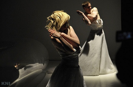 A felfújható, puha és átlátszó medence, a menyasszonyi ruhák lebegő tüllszoknyái, a világos színpad súlytalanná teszik az emberek szenvedését. A mozgás, a drámaiság elvész ebben a közegben. A fogyatékos fiú tűnik az egyetlen eleven lénynek ezek között a kísértetek között.