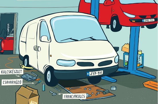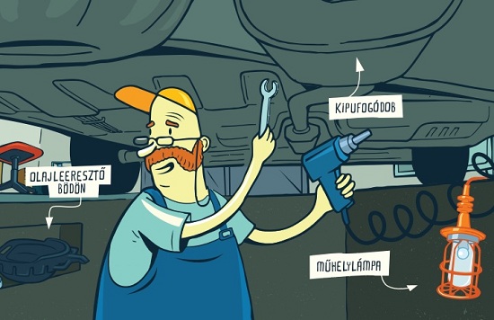 – Na, Márton, örülök, hogy látlak! Vigyázz, be ne verd a fejed! Érdekel az autó alja? Látod, ez itt az alján végig a kipufogó. Most meg lehet fogni, mert hideg, de különben forró tud ám lenni! Nézd, így mozog, mert lazán van felfüggesztve. Ez még jó lesz egy ideig, nem rohad. Elöl meg a motor. A motor alján pedig itt az olajteknő, karternek is hívják, ebben van az olaj. Ha nem cseréljük ki rendszeresen, akkor hamarabb tönkremegy a motor. És ez itt a lényeg, fiacskám, az olajleeresztő csavar!