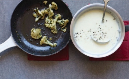 • Az alaplét és a tejet tegyük nagyobb fazékba nagy csipetnyi sóval és csipetnyi sáfránnyal. Forraljuk föl, tegyük bele a karfiolrózsákat, mérsékeljük a lángot. Gyöngyözve főzzük körülbelül 5-8 percig, amíg a karfiol épp hogy megpuhul.