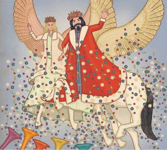 A szelíd tekintetű, nemes vonású pegaurkirály és a pegaurkirálynő fejükön virágkoronával kecsesen ereszkedtek le a magasból. Kezükben egy-egy kosarat tartottak, amelyből színes virágszirmokat szórtak a pegaurok elé.