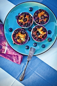 3. Szórj 4 szem áfonyát mindegyik muffinforma aljába, majd egyenlően töltsd fel őket a masszával, végül a tetejükre is szórj 4 szem áfonyát.