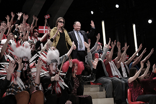 Mellbevágóan indul az előadás: a lelátón ül mindenki, aki él és mozog, Dánia zászlószíneire festett arccal, piros-fehér ruhákban – és szurkol. Az új király, Claudius bejelenti a végtelen célszerűségből elkövetett házasságát a sógornőjével, Gertrud tehát nem özvegy, hanem változatlanul királyné.