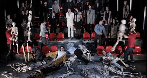 Az, hogy a királyfi iskolatársait Claudius besúgásra biztatja, Polonius meg Opheliát ösztönzi, hogy udvarlójáról jelentsen, egyszerre jelzi a félelmet, hogy valami kiderülhet, aminek mélyre temetve kellene lennie. Dánia ura fél a norvégok közeledő seregeitől, fél Fortinbras hercegtől, de legfőképp a tömegektől fél. Még ha körül is veszik őt, s a lelátóról a legvadabb B-közép stílusú norvégellenes szitkok hangzanak fel. Azokból pedig még minden lehet. Lesz is. Az utolsó jelenet párbaját csontváz alakok nézik végig, és amikor a többszörös mérgezések után a dán uralkodóháznak írmagja sem maradt, e csontvázak borítják a lelátó előtti küzdőteret.