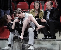 A stadion lelátója lesz mindennek a helyszíne immár. És Bagossy László rendezésében ez a sokkoló ötlet működik. Itt jelenik meg Hamlet király szelleme, itt szövődnek intrikák, itt történnek az árulások. Ez a trónterem, ahol a színészek a leleplező darabot játsszák, itt kóborol gondterhelten Hamlet királyfi, s őrülten Ophelia.