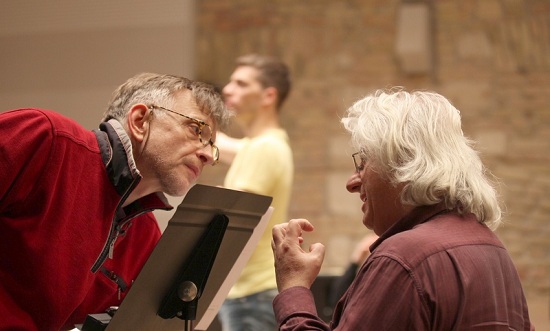 Mácsai Pál a látens szerepből hús-vér hang-figurákat alkotott: a szöveg maga kínálta a kihallgató(k), a hangverseny-kommentátor és a kézirat fölött mélázó szerző alakját. Kerekes Éva szövege különös visszhang, jórészt a férfi szövegeit ismétli meg. Egyszerre anyja és felesége a kihallgatottnak, de olykor – a szövegtől függetlenül – ő a keresztfa alatt álló Mária (Stabat Mater) és Magdolna is.