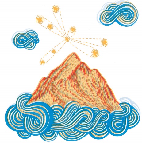 A virágoktól tarka sziget közepén égig érő hegy magasodott, a csúcsa örökké párába és ködbe burkolózott. Ameddig a szem ellátott, erdő borította, de senki sem tudta, mi van feljebb, mert egyetlen állat sem mert felkapaszkodni a fellegek közé, még a madarak sem. A szalakóta, aki egyszer, véletlenül – mert nagyon szórakozott madár volt – feljebb repült a szokásosnál, azt mesélte, hogy a nagy fehér puhaságban semmit sem lehet látni, és akkora a csend, mintha odafent nem is volna élet. Ettől kezdve úgy is nevezték a nagy hegyet, hogy Csendpalota.