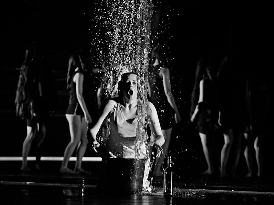Saját démonokra azért merek gondolni, mert (kihangosítva) halljuk mások (előbb vagy utóbb meggyilkolt versenytársak) suttogó szavait, de suttog Macbeth akkor is, amikor árnyékával (értsd: félelmeivel) beszéli meg tennivalóit. A trónért, a hatalomért való versenyfutás, majd a megszerzése utáni lelkiismeret-furdalás, a rettegés, hogy most már ő kerülhet kardhegyre – ezek mind sokkal elevenebb párhuzamok napjainkkal. De Luk Perceval bizonyára már mindezeket túl lejátszottnak gondolta. Nem baj ez, csak éppen bennem nem indított el semmilyen visszhangot, rezonanciát. Pedig társalkotóként a kiváló német koreográfus Ted Stoffer nagyon erős látvánnyal, a csupán hosszú hajukkal takart csupasz vészbanyák lassított, ám folyamatos mozgásával igyekezett felhívni a figyelmet arra, hogy most a nagybetűs Nőről szól a történet. A szenvedélyt, a lélek bomlását (?) pedig az elviselhetetlenségig erősített, bár nagyon virtuóz zene (Lothar Müller, gitárszóló: Pavel Mihejev) harsogta belénk.