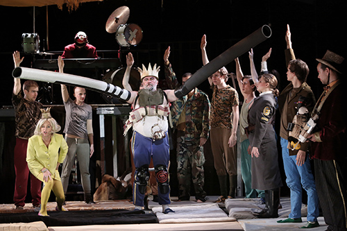 És még egy háttér-munkatársat ki kell emelni: Kákonyi Árpád zenéje a színészekkel egyenértékű főszereplő. Nem tudom, valóban szükséges volt-e, habár látványos geg, hogy Rozamunda királynéként Ficza István áll borostásan, szakállasan Vencel király mellett – idézve a szakállas eurovíziós dívát. Azt hiszem, az Örkény Übüje lényegesen tovább marad műsoron, mint amennyit emlékeznének Rozamunda modelljére…
