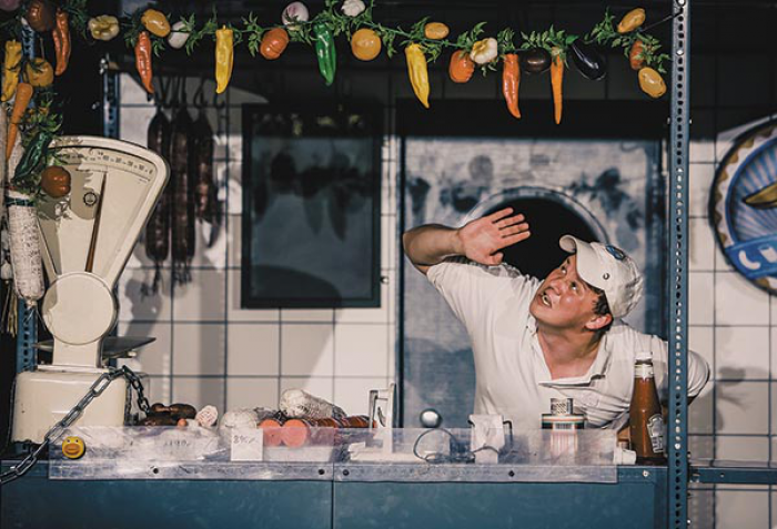 A látott produkció egyszerű elvek alapján épül, ráadásul nem is hat az első percben. De hat. Mesélőnk, az ezerarcú Ötvös András egy félévnyi élményt oszt meg velünk. Adott egy kocka alakú, forgatható csemegepult, ami részeiben és felénk fordított arca szerint persze lehet bármi más is: lakás, gang, kocsma, teherautó platója, híd. Aztán van még néhány műanyagból készült füstölt hentesáru, paradicsom, paprikafüzér, csomagolóanyag, pár konzerv, a pénztárgép, felmosó mopp, műanyag láda, egy lánc, egy elaggott frottírtörülköző darabja, ja, és lábtörlő is. A felsorolás azért fontos, mert ezek a tárgyak igen leleményesen jelenítenek meg mindent és mindenkit az előadás folyamán. Talán nincs is tárgy, leszámítva a paprikafüzért, ami ne nyerne önálló, másik, emberi életet. Ötvös úgy játszik, ahogyan ma kevés színészt láttunk játszani. Közvetlen, mintha valami oltári bulin volnánk, és ő mint a nagydumás osztálybohóca mesélne. A színpadi játékon belüli szerepjáték: színkavalkád. Karaktereket jelenít meg, tárgyakat animál hanggal, mozgással, színészi és bábos technikákkal. Vibrálóan, virtuóz módon.