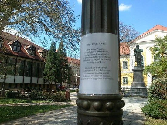 Április 11-én posztoljunk verset az utcára, legyen egy vers a hirdetőoszlopokon, irodák üzenőfalán, két eladó/kiadó hirdetés között, és minden legálisan »posztolható» felületen. A helyszín a fantáziátokra van bízva – erről már tavaly is kiderült, hogy határtalan.