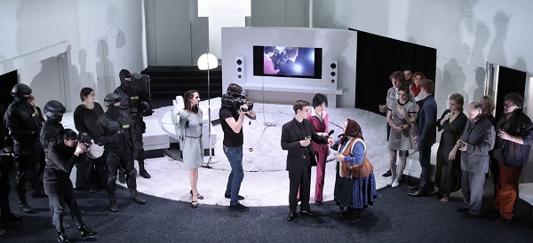 Bagossy Levente díszlete a kettős forgószínpaddal minden helyiségnek új arcot ad, de a fő ötlet, hogy valamennyi változást a szereplők távirányítói működtetnek, akárcsak a súlyos szerepeket játszó plazmatévé képeit. Az egyenesben közvetített tudósítás a legvégén a királyi kegyelemről végtelenül szellemes, áthallásos lelemény.