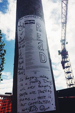 A magyar költészet napjára meghirdetett Posztolj verset az utcára! nevű gerilla-akcióban több ezren vettek részt, legalább 23 országban, több száz helyszínen, a beküldött képek tanúsága szerint szinte megszámlálhatatlanul sok verssel hoztak létre a fél világra kiterjedő, spontán street-art performanszt.