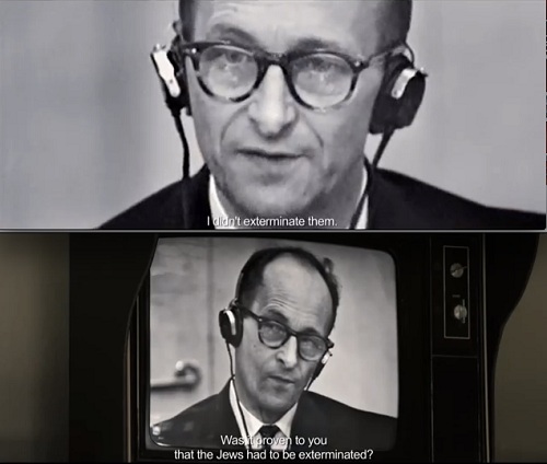 A legfigyelemreméltóbb lehetne (habár a filmes ínyencek ez ellen tiltakoznak): a technikák keverése. Egyfelől léteznek még a per követése során tudósítássá vágott szalagok, másfelől pedig a jelenben, színészekkel készült a rekonstrukció. A tanúk megszólaltatása: eredeti. Az kavarta fel 1961-62-ben az emlékezetet. Hurwitz magánélete, szabadideje: fikció. Amikor az alkalmi stúdióvezérlőben ül: a monitorokon az eredeti képanyagot látja. Azt keveri, azon próbálja tetten érni Eichmann emberi gesztusait. (Eredménytelenül.) A kettő összeillesztése ennek ellenére, még ha egy-egy snitt túl sokszor is kerül a szemünk elé, képes azt az illúziót adni, hogy rekonstrukcióban játszó ügyész, bírók, tanúk – azonosak a gyöngébb minőségű, fekete-fehér film- vagy mágnesszalagokon megőrzött alakokkal.