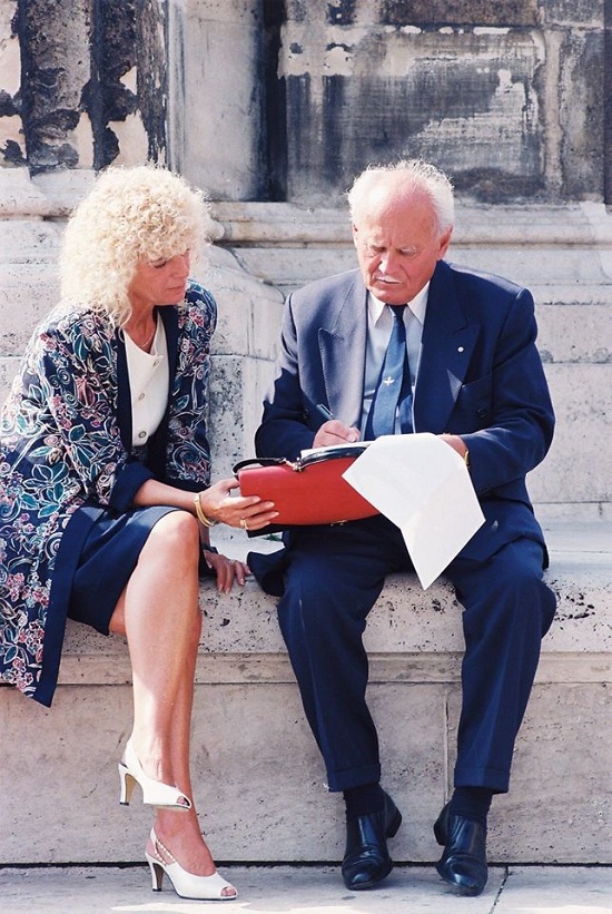 Az egyik legkedvesebb közös fotónkkal búcsúzom. 1997-ben készült a Szentháromság téren. Interjút készítettem Göncz Árpáddal és Ő egy tanácskozásról távozva azt javasolta, üljünk le szoborhoz és ott nézzük át a kéziratot. Kérdeztem: nem lesz ebből baj?