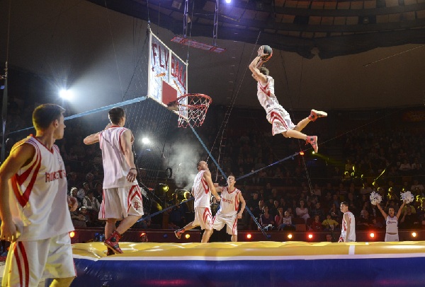 Szintén ukrán a Flying Ball csoport. Ezek a fiúk profi kosarasok, de a játékuk – cirkusz, és cirkuszi produkciójuk igazinál is vadabb meccs, ahol nem csak a labda kosárba dobása számít, hanem az is, hányféle szaltóval tudják elrántani a másik elől a golyóbist. (Ja és ha utána át is megy a gyűrűn? Hát, istenem…)