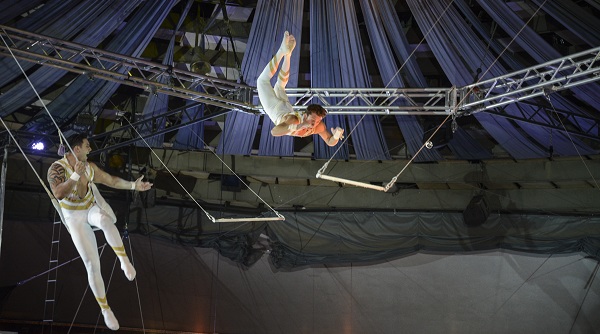 Minden cirkuszi program elengedhetetlen része, egy komolyabb trapézszám, a nézőket elrémisztő ugrásokkal, forgásokkal. A Flying Farfans (USA) csapatától a néző aztán tényleg megkapja a magáét, ugyanis a szokásos két, egymással szemben álló trapézt a csoport megduplázta, mégpedig egymást keresztező ugrásokat lehetővé tevő módon.