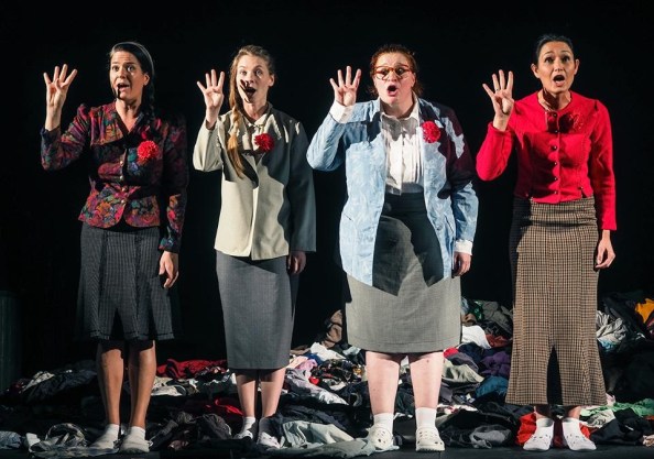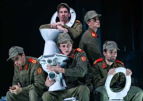 A színpadot ellepő óriási rongyhalom (Bagossy Levente díszlete) és az használtcikkpiac stílusú önleleplező stílustalanság (Ignjatovic Kristina jelmezei) beszédes képei egy szegénységet konzerváló és ezzel egyidejűleg nemesedés nélküli gazdagodást jelző kornak. A vendégekkel és akadémistákkal bővített társulatból (ld. lent) nehéz lenne bárkit is kiemelni, hiszen a csapatjelenetek mellett mindenki kapott szólót. És hát igen, ha az elején még az idősebb generáció mosolyogva vagy nevetve reagált is a hurrázó, indulót éneklő, az időben megállni látszó tömegre, ez a mosoly lefagyott ajkunkról (mondtam, hogy retró leszek), és aztán jött a borzalom vég nélkül.