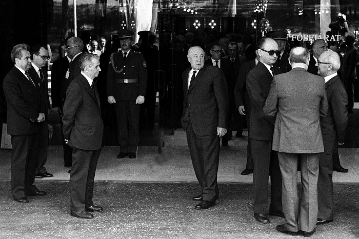 A válogatásban szerepel egy legendává nőtt kép is. A következő bekezdés szinte minden szavához hosszú magyarázatok szükségesek. 1986 nyarán tartott ülést Budapesten a Varsói Szerződés Politikai Tanácskozó Testülete. Valamennyi szocialista ország vezető politikusát meghívták. Sejteni már lehetett, hogy egyre mélyülnek a repedések a barátinak, sőt testvérinek mondott országok között. És a kép árulkodik arról, amit a szoros (de lazuló) gyeplőre fogott sajtó leírt szavakkal nemigen mondhatott ki.