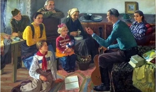 Mit láttam a Szovjetunióban? – ez Benedek Jenő olajképe volt kilencszázötvenben az I. Magyar Képzőművészeti Kiállításon*, és nyilvánvaló ösztöndíjast ábrázolt meghitt paraszti környezetben. A szuvenír üzbég sapkát, de paraszti származását demonstráló csizmát viselő főszereplőt egyebek közt piros nyakkendős úttörő-rokon, krumplit hámozó fejkendős anya, pilotkás, azaz új, szovjet típusú katonasapkát viselő honvéd hallgatja, valamint ősz nagyapa, aki épp olyan, mint akkor Bihari József Tiborcként a Bánk bánban.