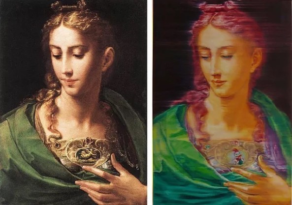 Szakavatott magabiztossággal követi el műtörténeti blaszfémiáit. Az after ReRe 2.V.11 rejtjellel ellátott táblán dereng a tisztelgő emlékezés Parmigianino Pallas Athénéjére, elmosódott vonások, fellazult színek, amelyek szinte elrejtik az istennő mell-ékét. Amely utóbbi a windsori eredeti vásznon Victoria-dombormű, jobb kezében pálma-, a balban olajággal, míg a Várfok utcában egyszer Miki egér, egyszer Donald kacsa.