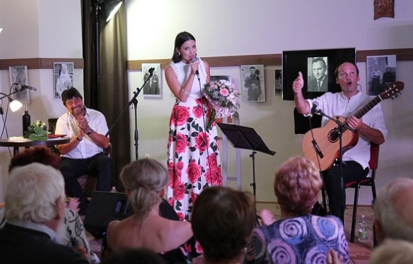 Szécsi Viktória és Nemcsák Károly műsora a Kalász László művelődési házban, gitáron Vihula Mihajlo kísér, hátul a költő portréja látható