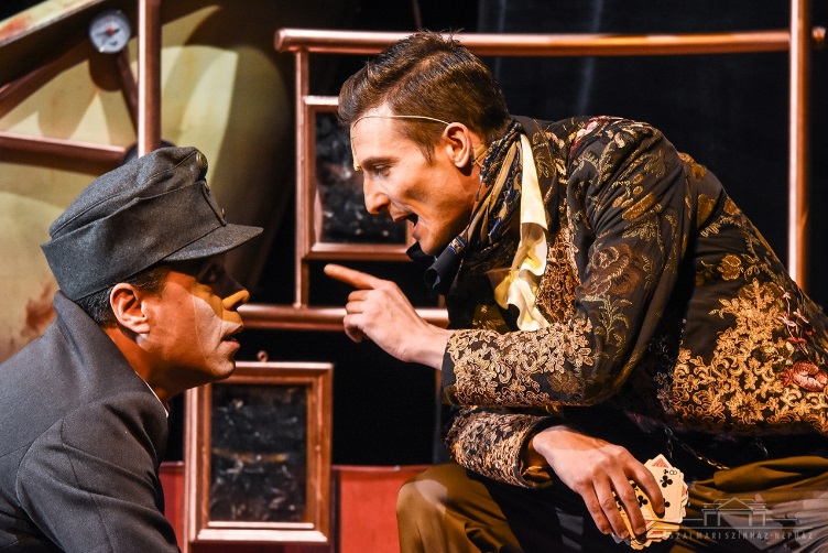 Az általam felfedezett rendezői elképzelés vizualitásában és mozgásban is a méltán világhírű cseh bábművészet (épp mostanság lett az UNESCO Világörökség része) elemeit, a vásári mutatványok, némiképp a cirkusz, sőt az olcsó mulatók hangulatát hordozza. Ha nem is nevesítve, de megjelenik benne a legismertebb hazai báb, Kemény Henrik Vitéz Lászlója és az ő felesége is, főként a hírhedt palacsintasütő – éppen a magyarokkal való kaland megjelenítése közben. Kiemelkedő, ahogyan „élő” bábot szerepeltet az előadás, mondhatni bravúros Gulyás Herman Sándor (beugró) alakítása. A bábos-mutatványos jelleget a jelmezek is hordozzák – Papp Janó figyelemre méltó munkája – szinte minden öltözéknek van határozottan ilyen részlete, s ezáltal a díszletekkel is szoros szimbiózisban vannak a nagyszerű jelmezek.