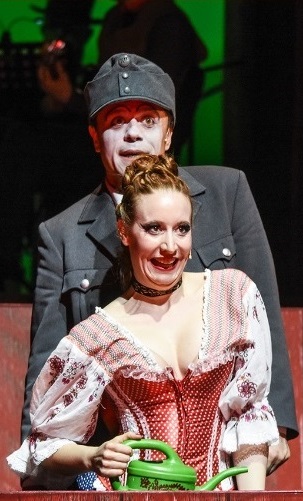 A zenekar végig jelen van a színen. (Zene: Borsos Pál/Éder Enikő) Ez nyilván nem újdonság, mégis, itt a folytonos „mesélő”, képmutogató attitűdöt erősíti, vagyis tudatosítja bennünk, hogy egy nagyobb szabású történet, ha úgy tetszik egy Élet morzsáit kapjuk a jelenetek során. A zenészek, ha nem is cselekvő részesei a mesének, végig az aktív szemlélő státuszában vannak. A kupléként szinte önálló életet élő betétdalok erőteljes hangzása egyszerre mondén és friss, s néhol – mint az oroszok megjelenésénél – szívbemarkolóan groteszk is. S itt kell kiemelnem: a színészek kiválóan énekelnek.