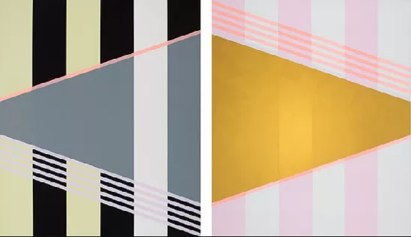 És azokat a tulajdonságokat most egyből régmúlttá teszik a finoman kitartó történelmietlen elemek. Olyan rózsaszín kontúr, amilyen a Kain fekvő trapézát (csonka háromszögét?) határolja, olyan áttűnő derengés, amilyen az Ábel aranyháromszögének hátteret ad, soha nem fordult elő, akármilyen nevű geometrikus és neogeometrikus elődben. Ráadásul az arany síkon némiképp átüt a mögötte húzódó rózsaszínes sáv, maga az arany felület kényelmes, nagy gesztusú ecsetmozdulatok egyenetlenségét viseli, a maga módján megidézve az egykor színnel robbantó, formákat kikezdő későbbi Nádler spontaneitását.