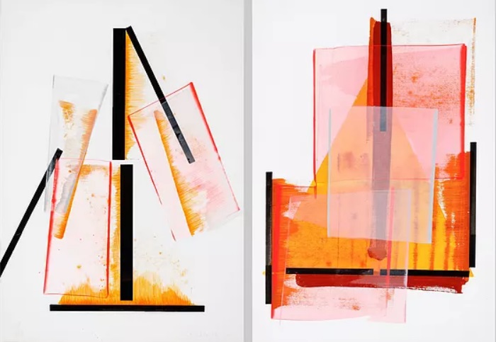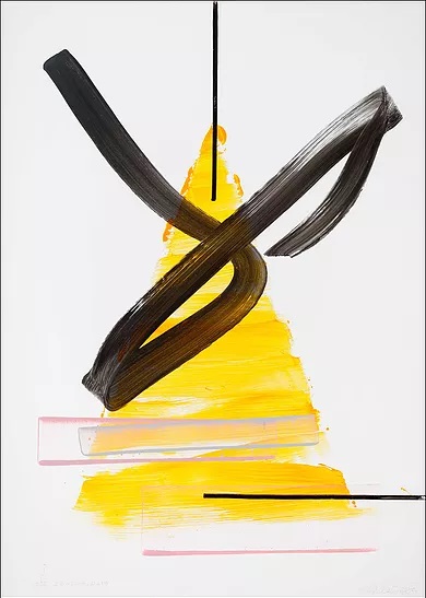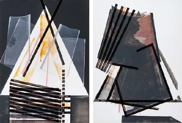 Mindazt, amit újrahasznosítanak a Biblia ihlette, de kevéssé biblikus nagy vásznak melletti papírmunkák. A megint csak háromszög uralta lap, amelyen a sárga síkidomot részben elfedi a némi jó szándékkal kalligráfiának is tekinthető fekete hurok, a mellette lévő, amelyen hasonló háromszögre transzparens szürkés síkok és orsóelemek vetülnek. Konkrét címek, feliratok nincsenek a két teremben, a kódolandó betű-szám elnevezésüket a Kisteremtől a reprodukciókkal együtt kaptam, a továbbiakban önkényes ábécéjelekkel próbálom elősegíteni az azonosítást.