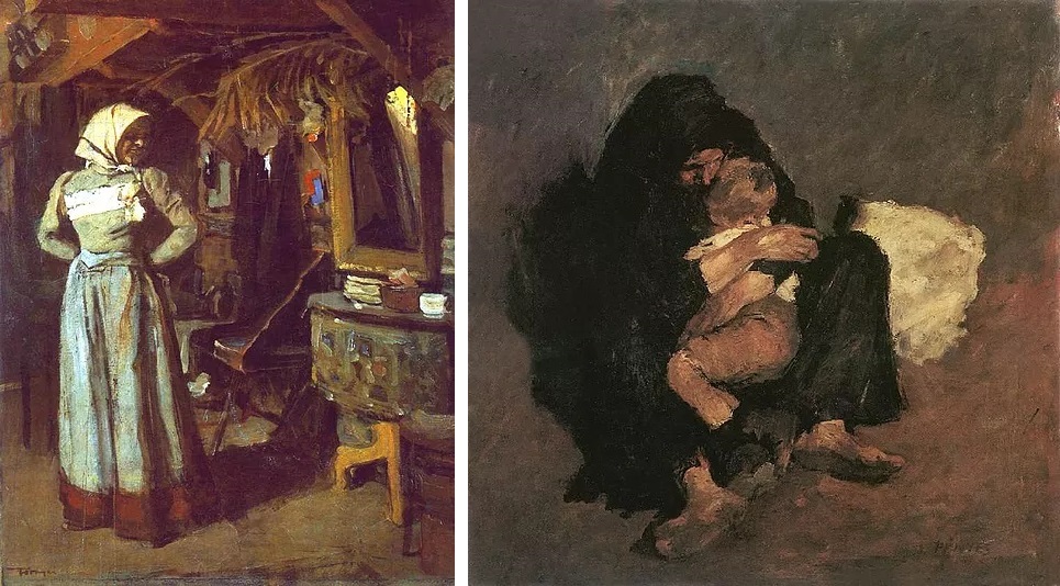 A menyecske illegeti magát a tükör előtt, a fiú egy késhegyre szúrt falatot bekapni készül, a hétköznapi, reális szemlélet – szituáció, embertípus, mozdulat – minden pittoreszk érték mellett érvényesül. Akárcsak szegénység és óvó szeretet Fényes Adolf Anya című képén, amelyen kemény plaszticitás helyett barnásfekete, zaklatottan festett foltok és elmosódott mezítláb sűríti a drámát, vagy Rudnay Hímző nőjén, amelyen meszesen fehér fejkendőfelületek teszik teljessé az elmélyült arc és elmélyült munka komolyságát.