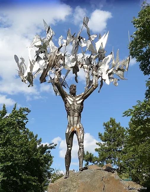 A krómacélból hegesztett Prométheusz a tapintatlan varrataival, a felsebzett acéllemez felületei alól kilátszó vashuzal-inaival és cső-ereivel nemcsak pátoszos emlékműve a mitológiai teljesítménynek, a hatalmas áldozatnak, hanem, bizony, nem is nagyon titkoltan, groteszkgyanús is. Ha nem tűznyelő artista is, amint egyik jószándékú kritikusa látni vélte, a felemelt lángcsóvában van némi sportolói-atlétagyőztesi mellékíz a kétségkívül éles, szabálytalanra szabdalt lángelemek fenyegetése ellenére, és maga a domborított-hegesztett, belül üres lemeztest is hordoz némi kétséget-kettősséget a megszokott tömör kő és a súlyos bronz emlékművekhez képest.