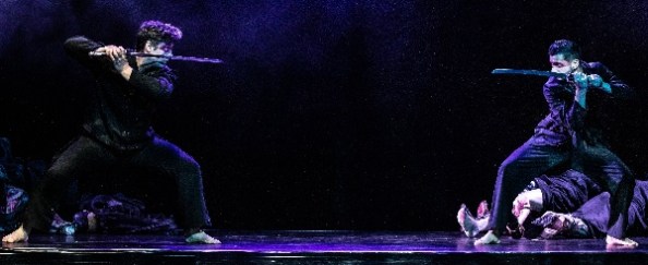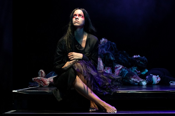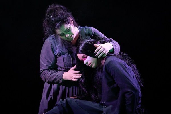 Az előadás a halál és a gyász misztikumát mutatja be a különös gyilkosságsorozaton keresztül. A Kósa Lőrincz által alakított lakájt/szolgát most bocsátották el munkájából, és éppen menedéket keres a közelgő vihar elől, amikor belebotlik a fájdalomtól az őrület határán táncoló öregasszonyba, a feleség anyjába (Kissjudit Anna). Kettejük párbeszédéből bontakozik ki Tadzsómaru (Bartus Barna), a férj (Erdős Róbert) és felesége (Topolánszky Laura) találkozásának és halálának rémisztő története. Az énekesek teljesítményét nem befolyásolta, hogy a koreográfia időnként kicsavart pózokra kényszerítette őket, magabiztosan uralták szerepüket. (A szereplők a Zeneművészeti Egyetem hallgatói, bár Kissjudit Anna tavaly már debütált az Erkel Színház Gioconda előadásában.)