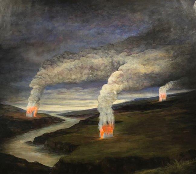 Három hajlék: a vásznon a poétikusan tizenkilencedik századi címnek megfelelően kanyargó folyó, szakadékos part, távoli, derengő ég és három kicsi kunyhó. Csak éppen mind a három úgy lángol és füstöl, mint a várak az a századi ostromképeken, és nem ez az egyetlen anomália a kiállítás címében ígért romantikához képest.