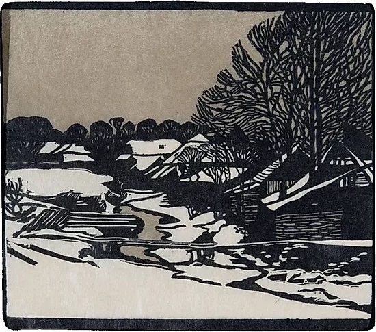 Havas falucska című színes linóleummetszete a Szépművészeti új kiállításának remeke. (Amely egyelőre biztonsági okokból nem látogatható. A szerk.) A háló-sűrű kopár fakoronák és a nagy, kiterülő fehér patakpart, a fegyelmezett ritmusba rendeződő házsor és a szeszélyes ornamentikaként kanyargó vízfolyás úgy alakítja az ellentétek sorát, hogy mindebből az artisztikumból az a puha, barátságos téli hideg is kikeveredik, amelyet faluemlékeink és falunosztalgiáink hitelesítenek.