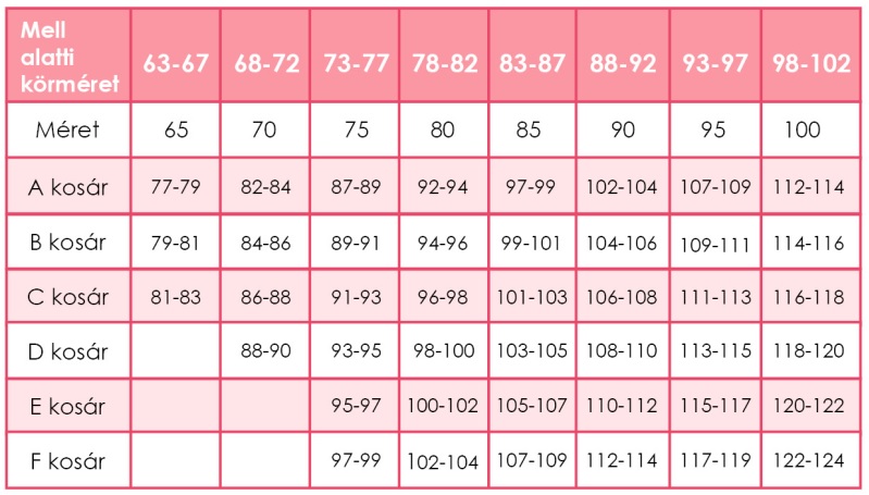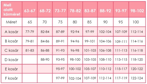 A számozás ötösével ugrik, vagyis, ha valakinek 72 vagy 77 centiméter a mell alatti körmérete, akkor valószínűleg a 75-ös méret lesz neki jó. A következő táblázatban mindent ki tudsz keresni, és még a kosárméretet sem kell magadnak kiszámolnod, mert megadtam centiben is!