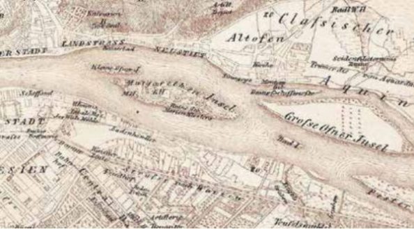 J. von H. Fuchsthaller térképének részlete, 1854. Ezen a Margit-szigettől jobbra még látszik a parányi Fürdő-sziget (Bad insel).