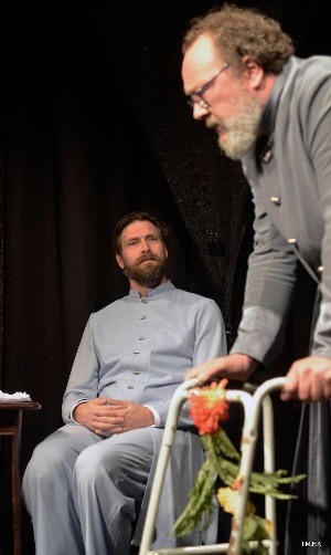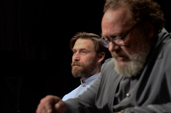 A mókás, még ha nem is elsődleges frissességű jeleneten a rendező csavar egyet: a darabindításkor az erkélyről instruálja két felkészületlen, helyenként bizonytalan szövegtudású színészét – vagyis a helyzet is emlékeztet valamire. (Hófehérke és a hét elgyötört törpe – felvétel előtti próba a rádióban.) Schneider Zoltán vén Mózese folyamatosan dühösködik, hogy tömérdek parancsolatát, tiltását semmibe veszik, pedig mennyit leisztolt a megalkotásukkal, és a hálátlanok még a nevére is alig emlékeznek. (Mert ugye nem is emlegetik, bezzeg az istenfiút mennyiszer!) Makranczi Zalán mint (krisztusi korú) Jézus türelemmel és szeretettel közelíti meg a kérdéseket, és magyarázgatja, hogy a túl sok tiltás helyett az ő toleránsabb szemlélete nagyobb népszerűséget ért el és így tovább, jobb volt a marketingje. Közben szépen beöltöznek az ó- meg újszövetségi próféta jelmezeibe. (Nagyon jók. Kösz, Veréb Dia!)