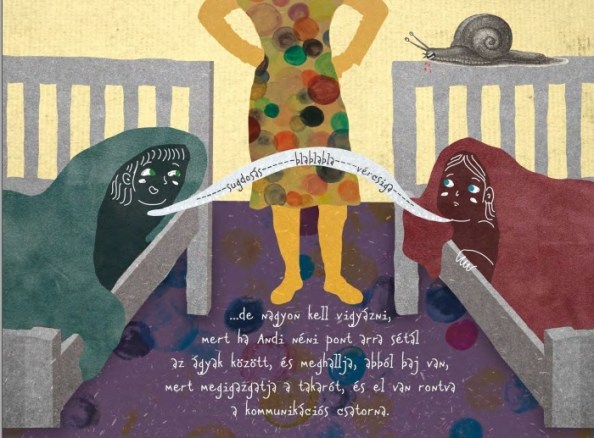 A sugdosást a takaró alól kell csinálni, kéz kidug, visszahúz, ott lesz egy lyuk, ha a lyukon ki akarsz beszélni, akkor a szájat kell odatenni, ha hallgatózni, akkor meg a fület, de nagyon kell vigyázni, mert ha Andi néni pont arra sétál az ágyak között, és meghallja, abból baj van, mert megigazgatja a takarót, és el van rontva a kommunikációs csatorna.