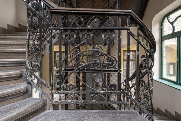 De itt, a Szűz utcában még virágos korszakát éli. A bejárat nagyon hasonlít a Szenes-házéra, felnézve – ezt a ház minden pontján érdemes megtenni – legyező formában néz vissza ránk egy nagy csokor virág. A főlépcső csigavonalban tekeredik a legfelső szintre. Középen a szokásos, dermesztően ronda lift pöffeszkedik. Biztosan hasznos, de ha tudták volna egy fokkal szebbre tervezni anno, mennyivel jobb lenne! Az utcára, illetve az udvarra néző lakások előtt tágas előtér szép, kovácsoltvas korláttal. Emlékeztet ez is a Thököly útra, ott a pillangók kovácsoltvas formában gyönyörködtetik a szerencsés látogatókat. Itt a homlokzat mögötti gangokon szívformájú virágok koronázzák az indákat. Az ajtók eredeti rácsozata is megvan még, újabban szép, sötétzöld festéssel. Minden részlet igényes, a melléklépcső szűk tereit bevilágító ablakok, a korlát díszei is.