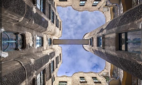 Pár évvel ezelőtti látogatásomkor épp dolgoztak a kapuhoz vezető folyosó és a lépcsőház felújításán. Az eredmény igényes, ízléses, halványsárga és fehér falaival fény költözött a kapualjba. Lefestették mindkét lépcsőház ablakait is, látszik, igyekszik a ház menteni, amit az elmúlt fél évszázad leginkább csak elhanyagolni tudott. Büszkék a lakók szép házukra, amire még bőven van mit költeni, de így is meseszép. A barátságos fiatal pár, aki beengedett, emlékeztetett: ne felejtsek el kilépni az udvarra, ha felnézek, ugye tudom, mit látok majd? Igen, a Kék Pillangót. Így, nagy betűvel. Bőven megérdemli a tervező, aki a pesti kőtengerbe úgy álmodik házat, hogy a szűk, kevés fényt befogadó belső udvart ölelő falak fent egy hatalmas, tökéletes pillangót formáljanak. A lepke középvonala pedig egy lélekvesztő folyosó a fő- és melléklépcsők között. Napi használatban, városi kötéltáncosoknak.
