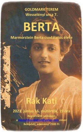 Rendkívüli előadás 2022. június 16-án, csütörtökön. Marmorstein Berta élettörténete Rák Kati előadásában látható-hallható