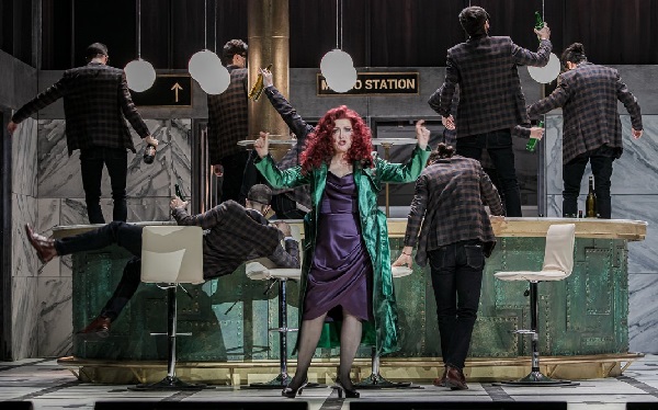 A librettó szerinti mű Hoffmann korában, Luther kocsmájában kezdődik. Székely Kriszta rendezésében: napjainkban, Lu (Gábor Géza) bisztrójában, mi több, egy nyugat-európai pályaudvaron, ahol ez van kiírva: Bistro de Lu (díszlet: Pallós Nelli, jelmez: Pattantyus Dóra). Ezt a pályaudvart nem teljesen értem; a műsorfüzetben nagyon szívesen olvastam volna egy interjút a rendezővel is, ahogy a Kesselyák Gergellyel készült beszélgetés igen hasznos információkat közöl. (Az általam látott előadáson Alain Guingal vezényelt.)