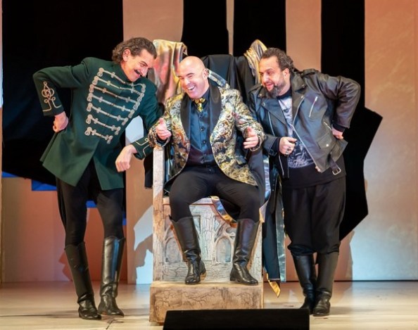 Minden kétséget kizáróan benne van a darabban és az előadásban is – ez nagy erény! – a mindenkori haszonlesés. Szinetár Miklós egyik nagy rendezői ötlete, hogy az első részben megjelenő regősökkel (Kiss Péter, Kiss Tivadar) árvalányhajasan énekelteti el a dalukat („Üdvöz légyen Géza fia…”), s ennek méltó párja, ahogy a zsinórpadlásról leereszkedő Nagy-Magyarországból mindenki, aki hozzáfér, letör egy darabot: szétlopják az országot. És látjuk a fanatizmust, amivel szintén folyamatosan találkozhatunk. Ezt Sarolt (Komlósi Ildikó) képviseli, vaskövetkezetességgel. Ő mondja azt is a fiának, kellő reálpolitikusi cinizmussal: „…Mást itt e nép meg nem ért, csak túlerőt. / Nem fogja fel, / a múltat és nem sejti még az eljövőt. / Szánalmas kis lény az ember, / önnön sorsán túl nem lát, / könnyen megtéveszti / néhány jól irányzott hazugság.” Bródy János azért zseniális szövegíró.
